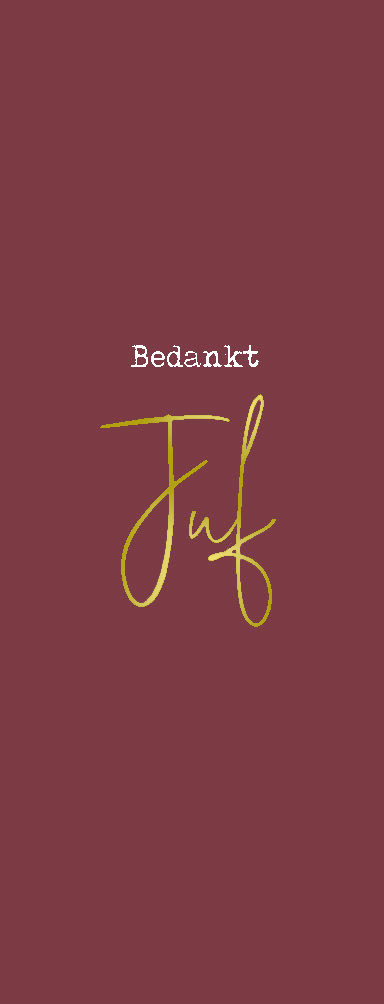 Luxe boekenlegger met de tekst: ‘Bedankt juf’. In de stijl van ‘Schrijven is Goud’, bedrukt met prachtig goudfolie.