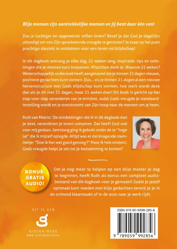 In dit dagboek ontvang je elke dag, 21 weken lang, inspiratie, tips en oefeningen die je meteen kunt toepassen. Misschien denk je: Waarom 21 weken? Wetenschappelijk onderzoek heeft aangetoond dat je binnen 21 dagen nieuwe, positieve gedachten kunt vormen. Dus… als je binnen 21 dagen al een nieuwe hersenstructuur met Gods blijdschap kunt vormen, hoe sterk wordt deze dan als je dit niet 21 dagen, maar 21 weken doet! Dit boek is gericht op het stap voor stap veranderen van je mindset, zodat Gods vreugde je standaardinstelling wordt en je overstroomt van Zijn hoop naar de mensen om je heen.