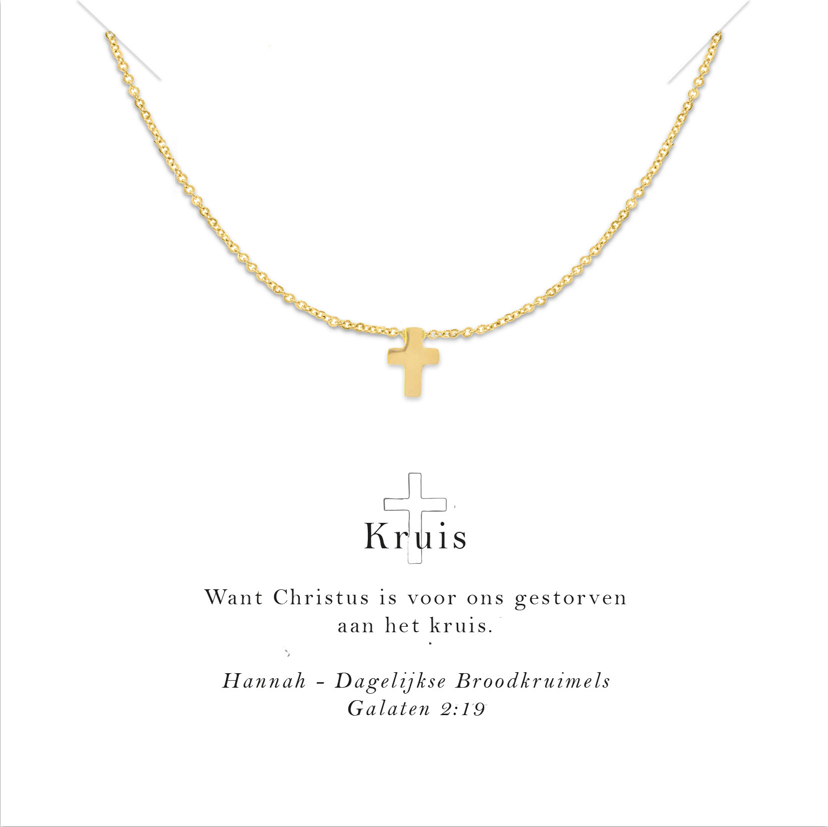 Goudkleurige ketting met een kruis gemaakt van stainless steel wat kleurvast en allergie-proof is. De ketting verwijst naar Galaten 2:19 en herinnert jou op subtiele wijze aan de mooie en krachtige beloften van God die Hij geeft middels zijn Woord.