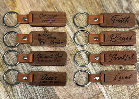 Schrijf als eerste een recensie “Sleutelhanger hout/leer De Heer is mijn”